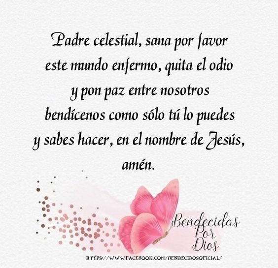 Padre Celestial, sana por favor este mundo enfermo, quita el odio y pon paz entre nosotros, bendícenos como sólo tú lo puedes y sabes hacer, en el nombre de Jesús, Amén.